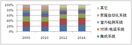 系统集成是一种技术,结合不同的安全功能成为一个全面的安全解决方案。该技术的实施需要供应商选择最合适的来自不同生产商的产品来用于特定的安全应用,集成它们而组成一个更大的安全系统解决方案,确保了互通互用性。这为终端用户提供了一个更好的,更具商业竞争力的系统解决方案。据SIA预测,2014年系统集成所占市场份额将达到25%。