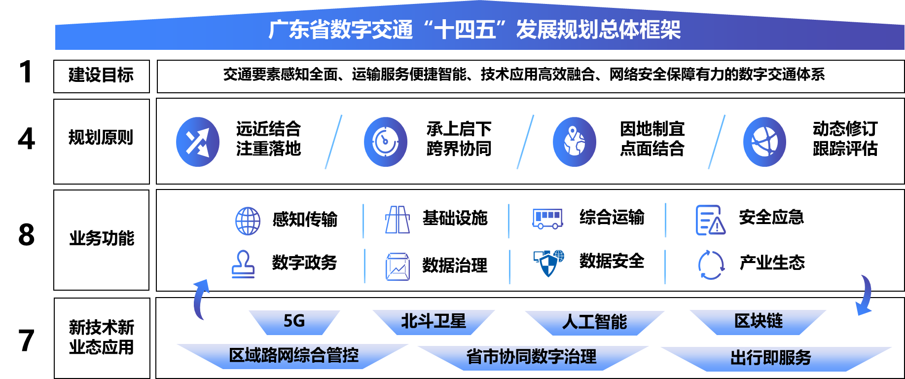 本规划以"数据链"为主线,以业务为驱动,聚焦行业痛点难点,提出数字交通感知传输、基础设施、综合运输、产业生态、数据安全等八大重点任务,重点开展"一夯实、三提升、三推进、一保障"(即1331)行业数字化工程,聚焦北斗卫星导航等七大类新技术新业态典型应用建设,推动人工智能、5G等新一代信息技术在交通运输领域深度融合与推广应用,打造新时期数字交通体系,全面提升广东省交通运输行业治理数字化水平,满足人民对美好出行的向往。